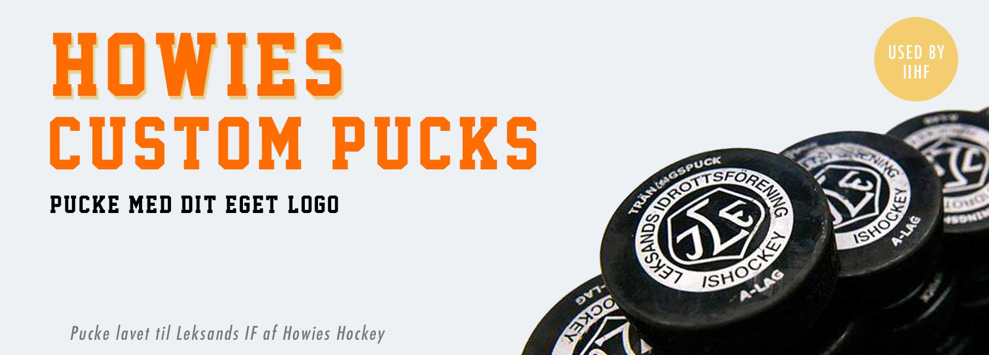Howies tilbyder hold og sponsorere specialdesignede pucke til gode priser. Gør som NHL og SHL hold og bestil dine egne pucke med dit eget logo, eller finansier puckene med et sponsorlogo. Ved at bruge sponsorlogo får sponsorerne gratis reklame og holdet får gratis pucke. Vi tilbyder tryk i guld, sølv, hvid og i UV-print i op til syv farver. Fra bestilling til levering, forventes 14-20 arbejdsdage.