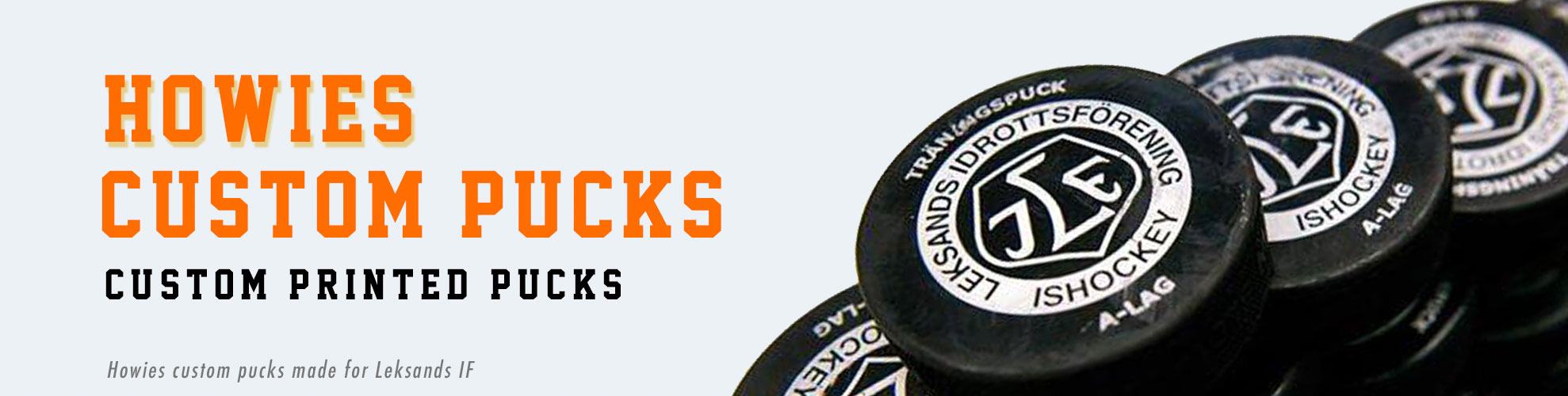 Howies offers teams and sponsors custom made pucks at great pricing. Do as the NHL or SHL teams and order your own pucks with your teams logo on or why not finance the pucks with a sponsors logo. By using a sponsors logo the sponsor gets advertisement and the team gets free pucks in return. We offer prints in gold, silver, white and UV print up to seven colors. From approval to delivery we estimate 14-20 working days.